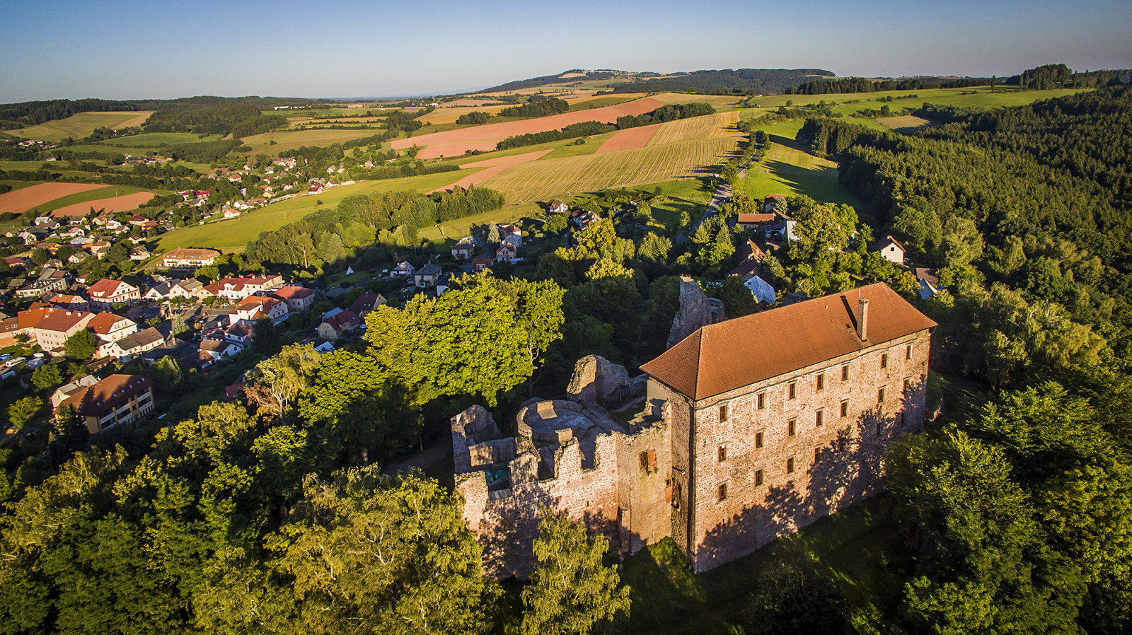 Hrad a městečko Pecka z dronu Ládi Válka